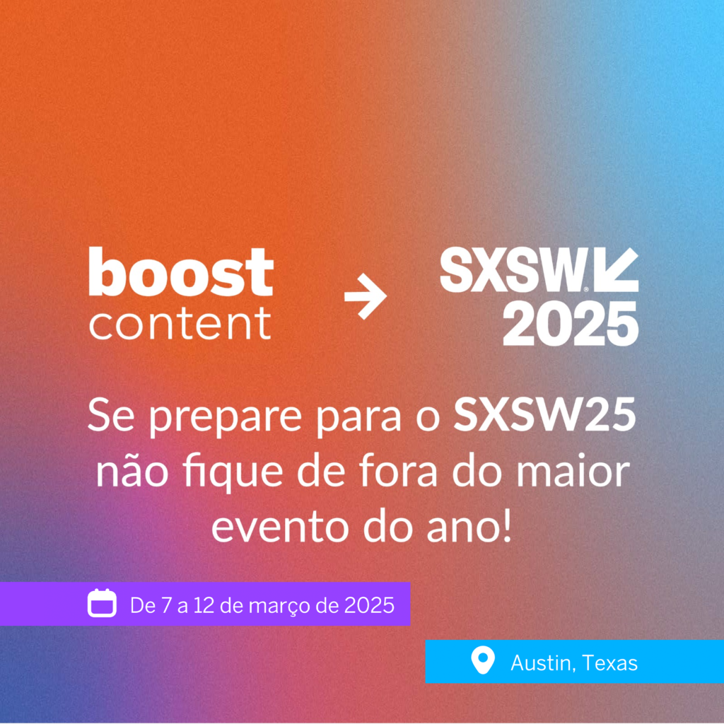 Prepare-se para o SXSW 2025, o evento que conecta mentes criativas de todo o mundo em um só lugar! Explorando tecnologia, inovação, cultura e negócios, o SXSW é o ponto de encontro de grandes ideias e tendências do futuro. E neste ano, a Boost Content está à frente do convite. Quer saber mais detalhes sobre o que vem por aí? Entre em contato com a gente pelo e-mail: contato@mycow.com.br e fique por dentro de todas as novidades!